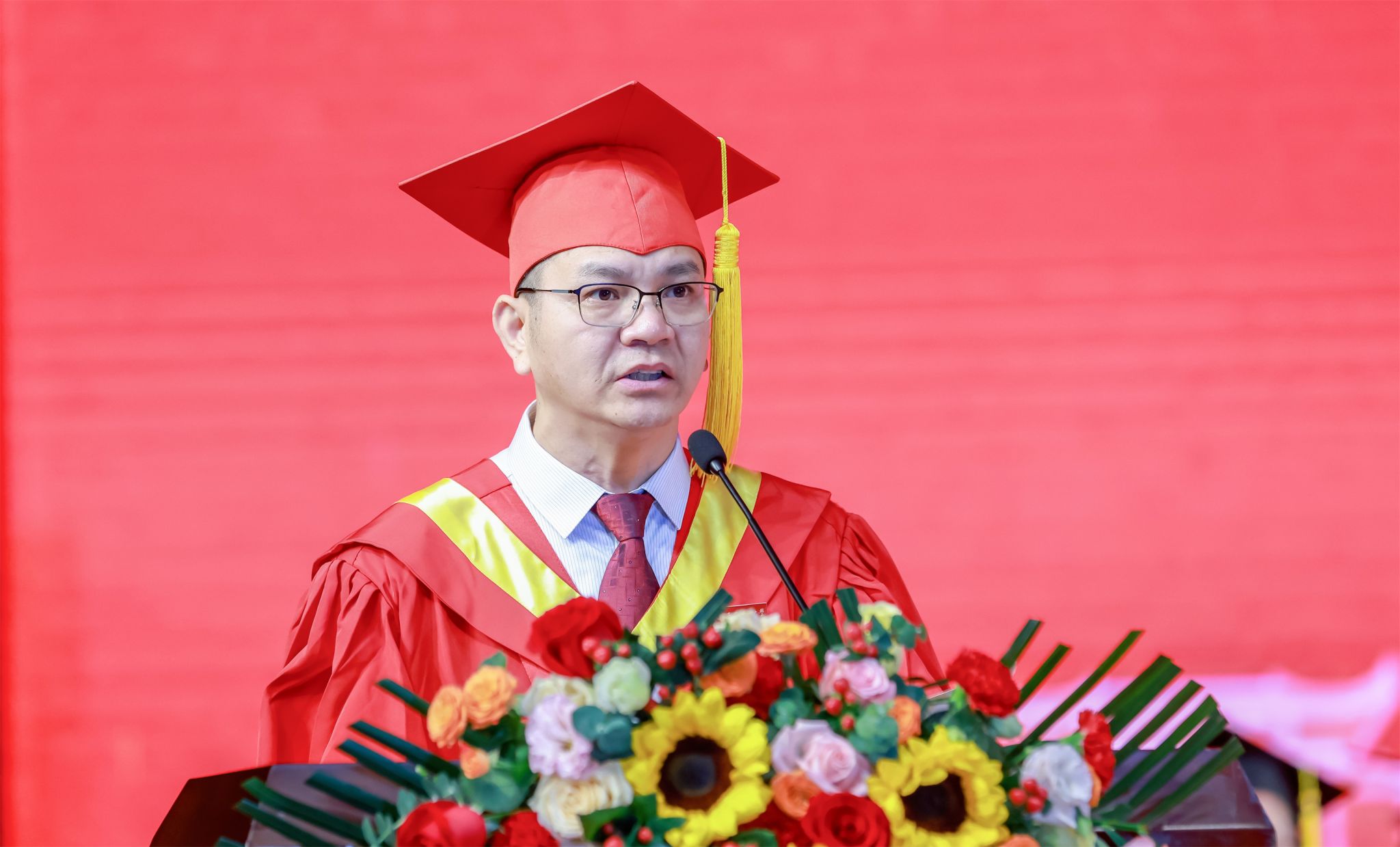 地理科学与规划学院罗国玮老师作为教师代表发言。他希望毕业生永远保持学习的热情、保持乐观积极的心态,勇于担当,积极奉献,在新的征程中继续追光逐梦、砥砺前行,创造出更加辉煌的业绩,为母校争光添彩。