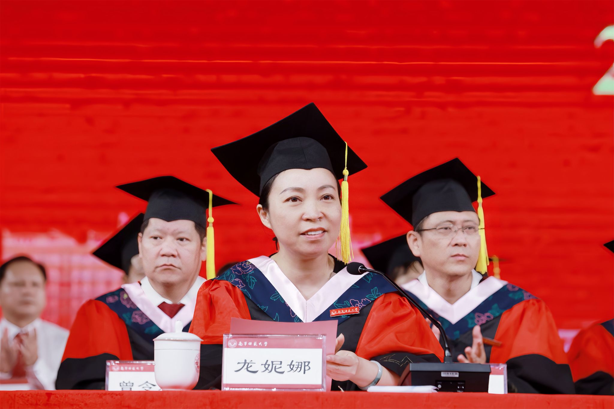 物理与电子学院韦师同学、教育科学学院肖沅依同学分别代表本科生、研究生全体毕业生发言。他们分享了满载收获与感动的在校求学成长经历,表达了对母校和老师的不舍与感激,表示未来将怀揣“德才并育,知行合一”的精神,伴着“待青春梦圆,郁郁桃李,芳华人间”的南师歌声,不负韶华,挺膺担当,踔厉奋发,逐梦远航。