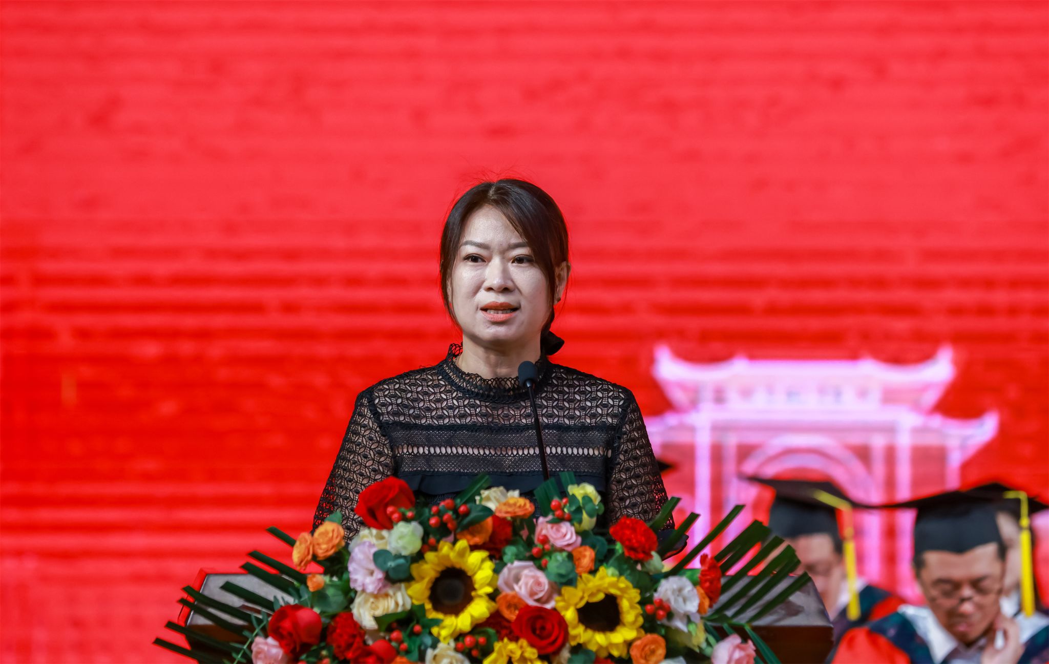人工智能学院李京鸽的母亲吕颖女士作为家长代表发言。她回顾了孩子大学四年的成长变化,感谢问鼎手机版与老师的精心培育,希望孩子们永远铭记母校的培育之恩,带着母校给予的力量和荣光,服务社会、报效国家。