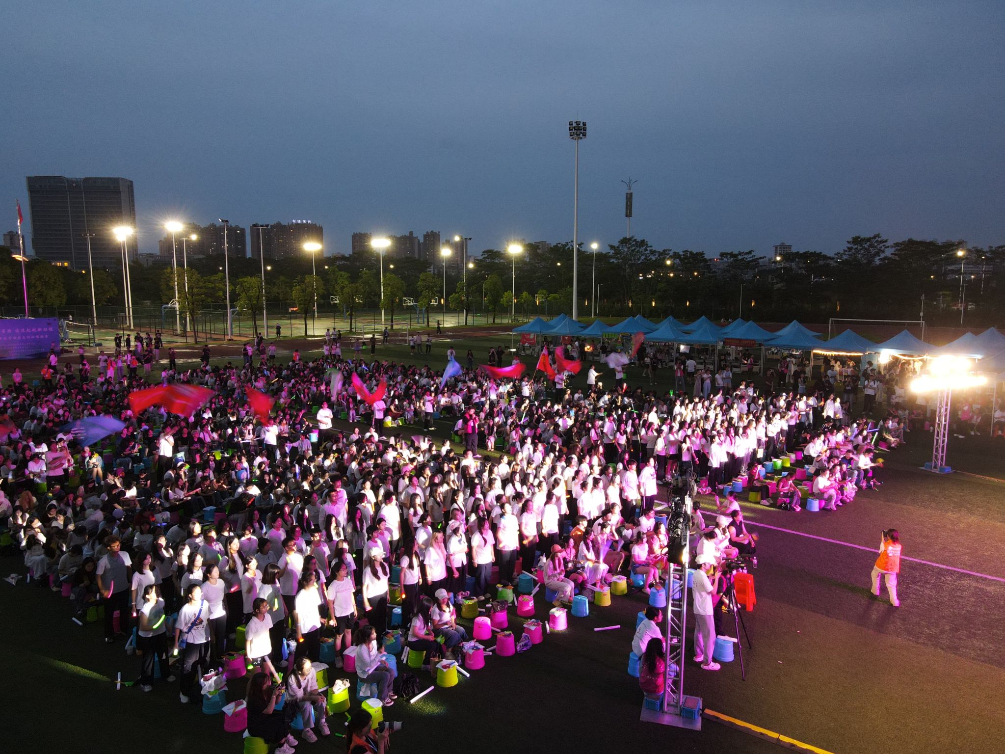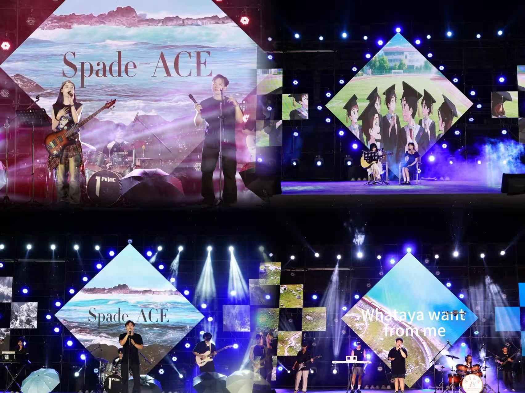 夜幕降临,草地音乐节正式启幕。五合校区“铭记青春”专场分为“南师回忆录”“理想指南针”“未来新世界”三个篇章。在朦胧的细雨中集合了越南留学生演唱、大学生艺术团热舞、校园十大歌手倾情演唱和活力四射的啦啦操等表演,现场欢呼不断,五合校区各学院代表团《青春加油曲》更是彰显了青春该有的魅力。