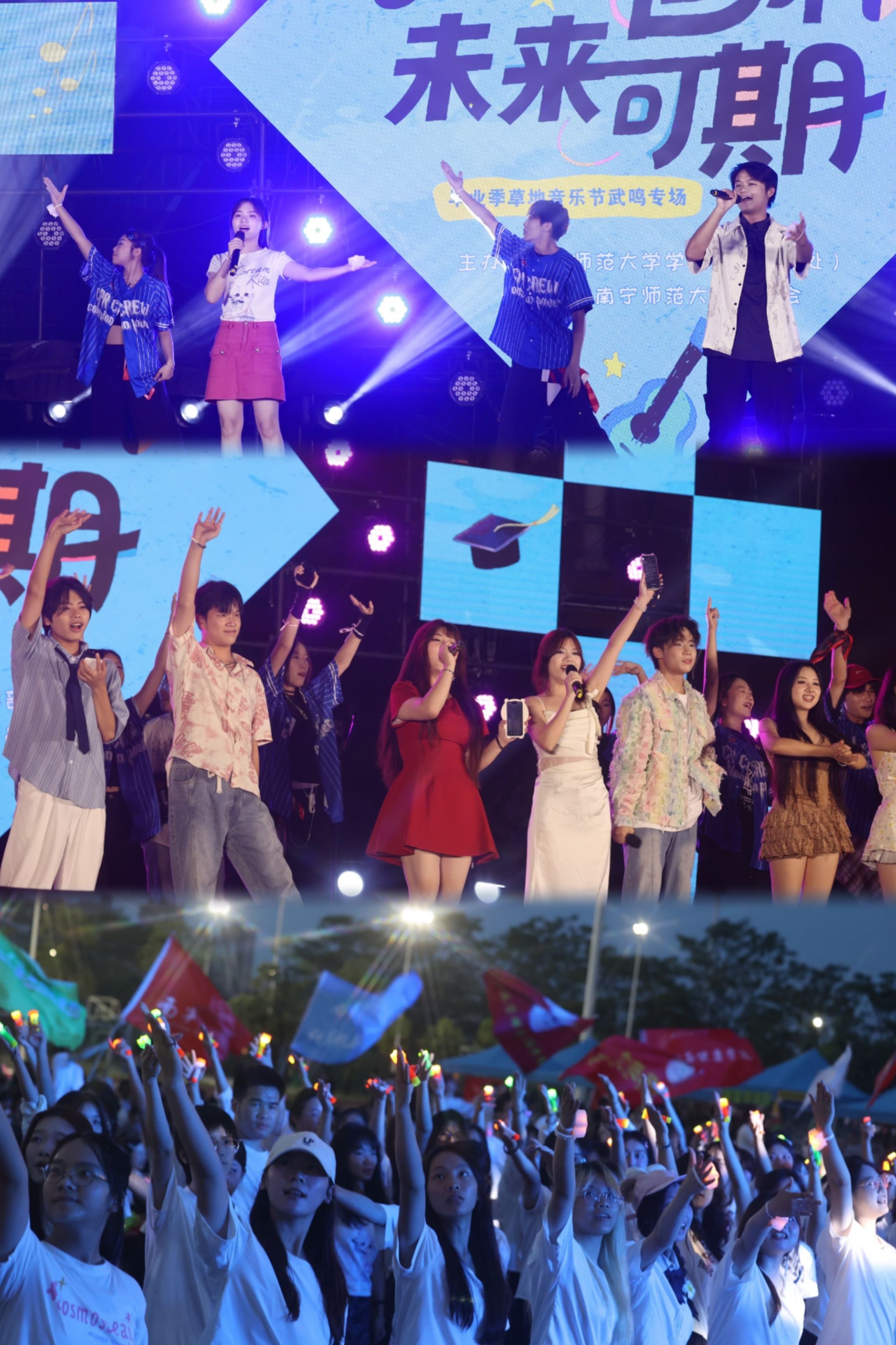 武鸣校区“未来可期”专场分为“启·时光隧道”“忆·声动年华”“盼·星河远航”三大篇章,节目精彩纷呈。街舞表演《爱出发》点燃全场热情,原创歌曲《你好,南师大》勾起初入校园的美好回忆,在《一起向未来》的旋律中,演员与观众共同挥舞旗帜,激昂的歌声响彻夜空。音乐与舞蹈学院毕业生黄玮衡用两首原创音乐致敬母校,寄语学弟学妹突破桎梏拥抱美好未来。活动尾声,上百只气球承载着毕业生对未来的美好期许冉冉升空,最后以一首《再见》缓缓结束了这场关于毕业的狂欢。