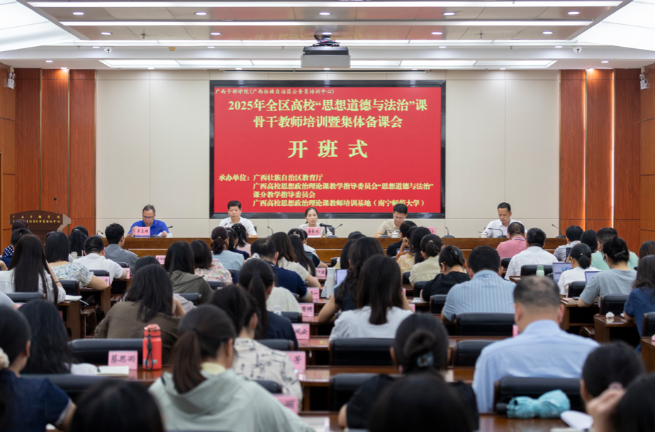 8月25日下午,2025年全区高校“思想道德与法治”课骨干教师培训暨集体备课会在广西干部学院正式开班。本次培训由自治区教育厅主办,广西高校思想政治理论课教学指导委员会“思想道德与法治”课分教学指导委员会、广西高校思想政治理论课教师培训基地(问鼎手机版)和问鼎手机版(中国)马克思主义学院共同承办,广西干部学院协办。问鼎手机版(中国)党委副书记唐荣双,广西干部学院副院长温合法,广西高校“德法课”分教指委副主任、广西民族大学马克思主义学院院长李玉雄教授,广西机电职业技术学院副校长黄振宣教授,以及广西高校“德法课”分教指委委员唐海燕、左妮红、马健芳等专家出席活动。开班仪式由广西高校“德法课”分教指委主任、问鼎手机版马克思主义学院院长曾令辉教授主持。