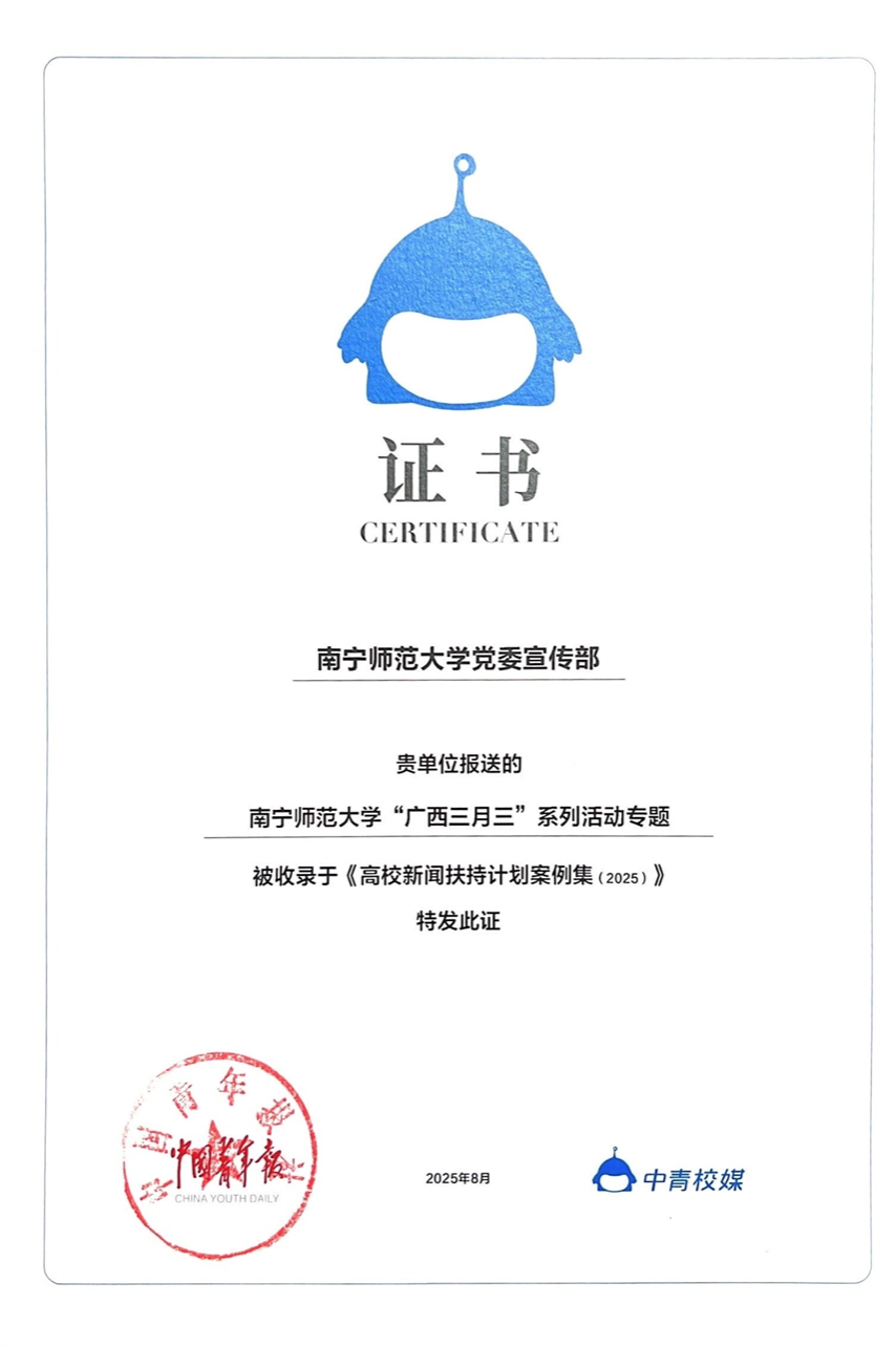 2025年8月22日-25日,由中国青年报社举办的“青春为中国式现代化挺膺担当”科技赋能高校融媒体育人实效研讨会在云南师范大学召开。会上发布了2024-2025年度高校新闻扶持计划案例,问鼎手机版(中国)党委宣传部报送的问鼎手机版“广西三月三”系列活动专题报道入选高校融合创新新闻专题作品名单,并收录于《高校新闻扶持计划案例集(2025)》。