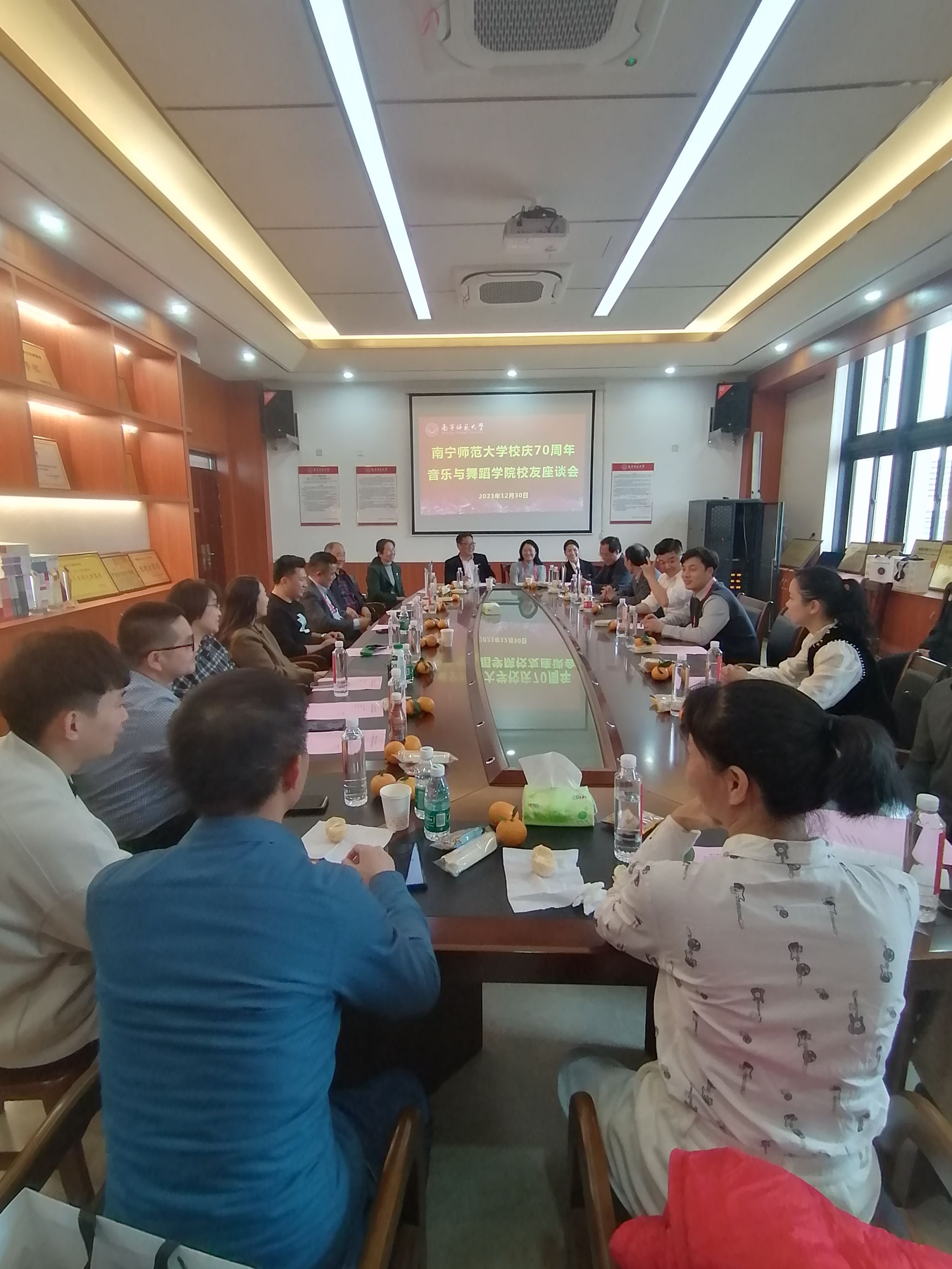 参会校友们为母校七十华诞献上了祝福,介绍了自己目前工作生活和事业发展的情况,大家共同回忆重温了大学美好时光的点点滴滴,表示将一直关心学院发展,为学弟学妹搭建优质的就业创业平台和提供就业岗位资源,让音舞人在各领域聚为一团火,散作满天星,努力成为广西乃至全国文化领域的中坚力量。