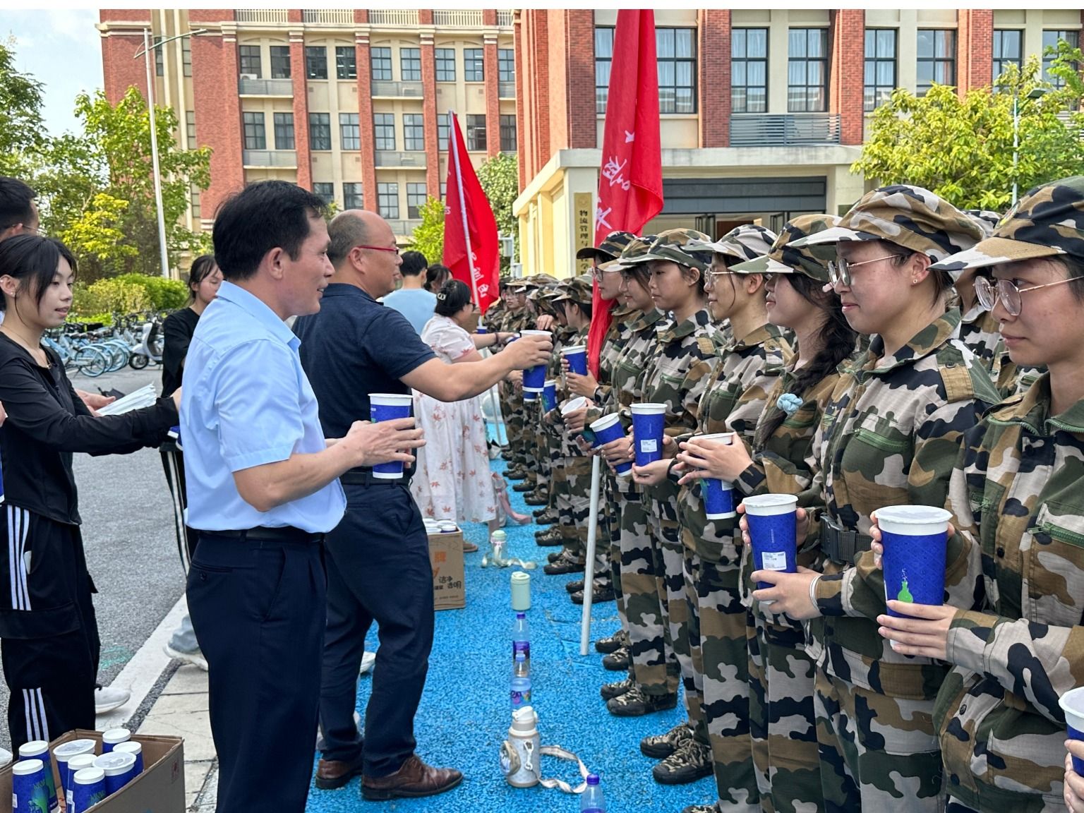 训练场上,同学们精神抖擞,意气风发,在教官的悉心指导下认真进行着训练动作。黄在堂向辛勤付出的教官们表示由衷感谢,对同学们的努力训练给予鼓励,他希望同学们严格遵守训练纪律,同时也要注重自身安全,努力提升综合素质。余敢才亲切慰问同学们并指出,军训不仅是学习技能、磨炼体质的重要过程,更是党和国家为培养青年一代坚定意志、塑造优良作风的“关键一课”。他勉励同学们通过训练增强国防意识,锤炼意志,强健体魄,系好大学的“第一粒扣子”。接着,领导老师们为军训教官和同学们送上了清凉果茶,让同学们倍感欢喜,本次慰问活动在集体合影中落下了帷幕。