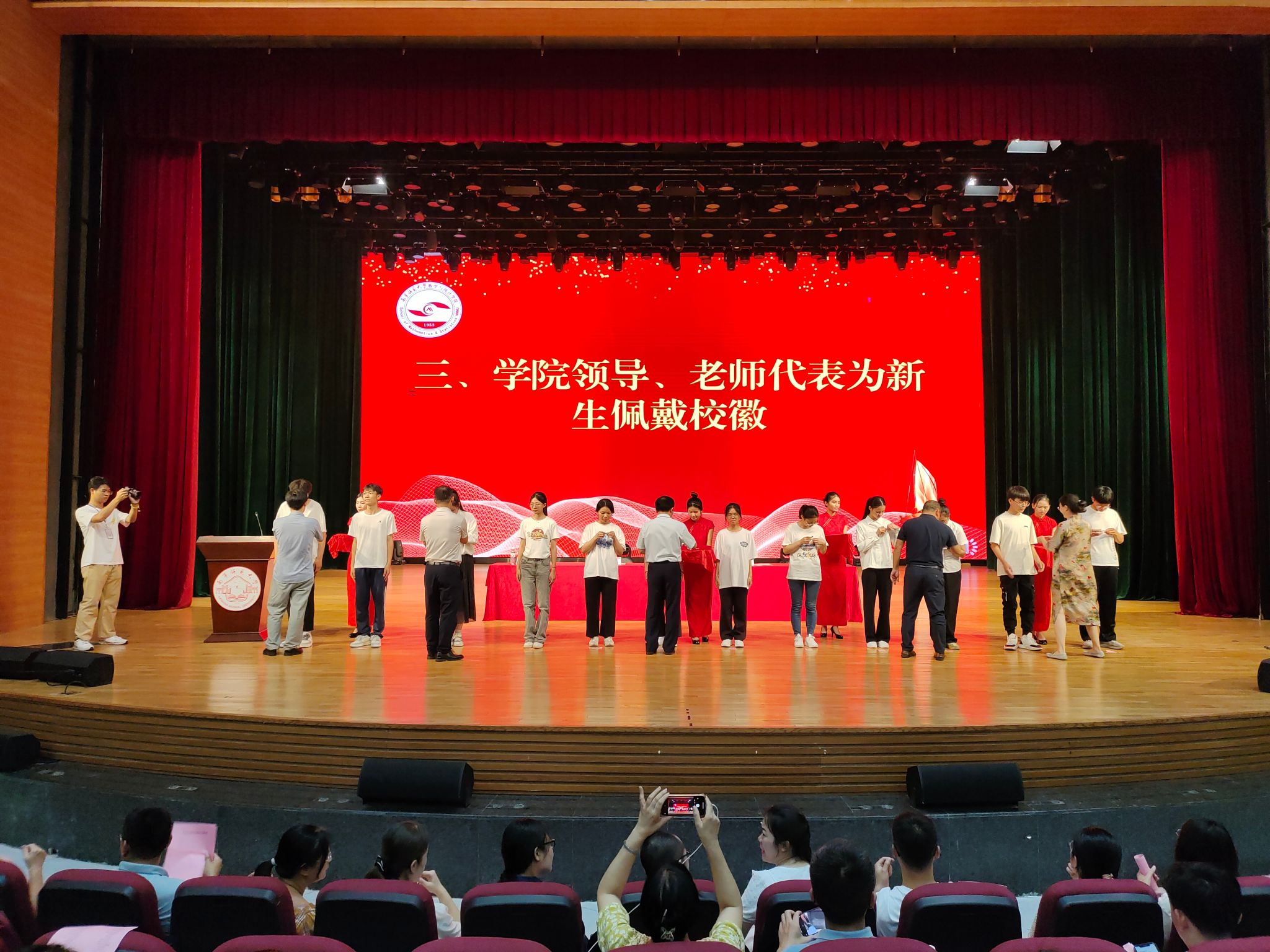 典礼在庄严的国歌声中拉开序幕,该院领导、老师代表为2024级新生佩戴校徽。