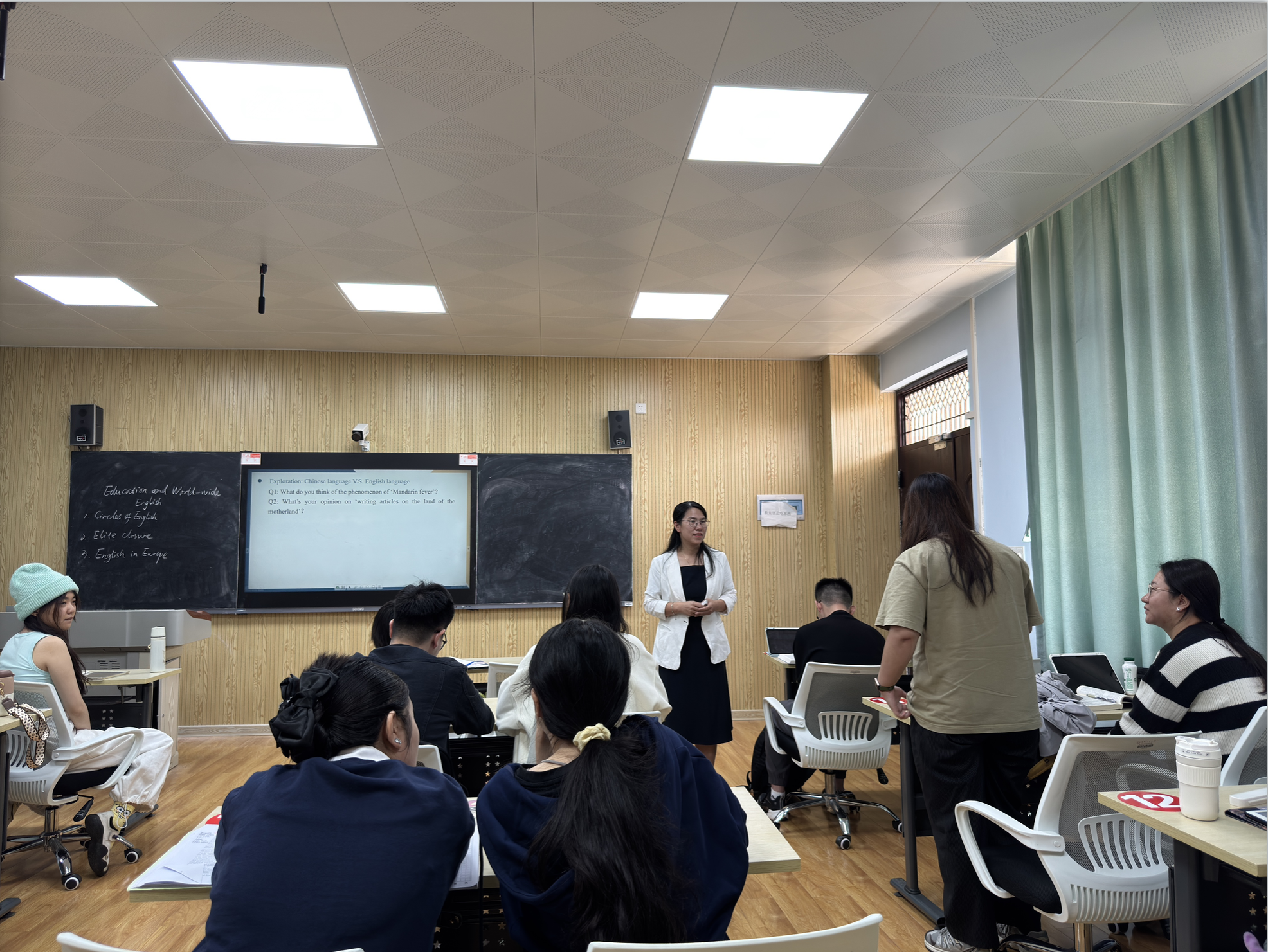 此次公开课由外国语学院蒙岚副院长主讲,讲授的课程是英语语言文学专业、外国语言学与应用语言学专业的研究生课程《社会语言学》。公开课上,蒙教授以专业课程内容为基石,巧妙地融入思政元素。在讲解英语在教育中的影响时,蒙教授通过引入丰富的案例,将思想政治教育自然地渗透其中。例如,在探讨“英语圈”、“精英封闭”等社会语言学概念时,引导学生思考英语在不同英语圈国家中发挥的作用。由此联系到英语与汉语国际地位的对比,以此引出汉语的国际地位日益提升,吸引了越来越多的汉语学习者。蒙老师还播放了一段“汉语热”的视频片段,生动形象地展现了世界对汉语需求的日益增长。同时蒙老师引用了习近平总书记的讲话,强调了要将论文写在祖国大地上。她引导学生积极思考,让学生在掌握语言技能的同时,深刻领悟到用英语讲好中国故事的重要性。