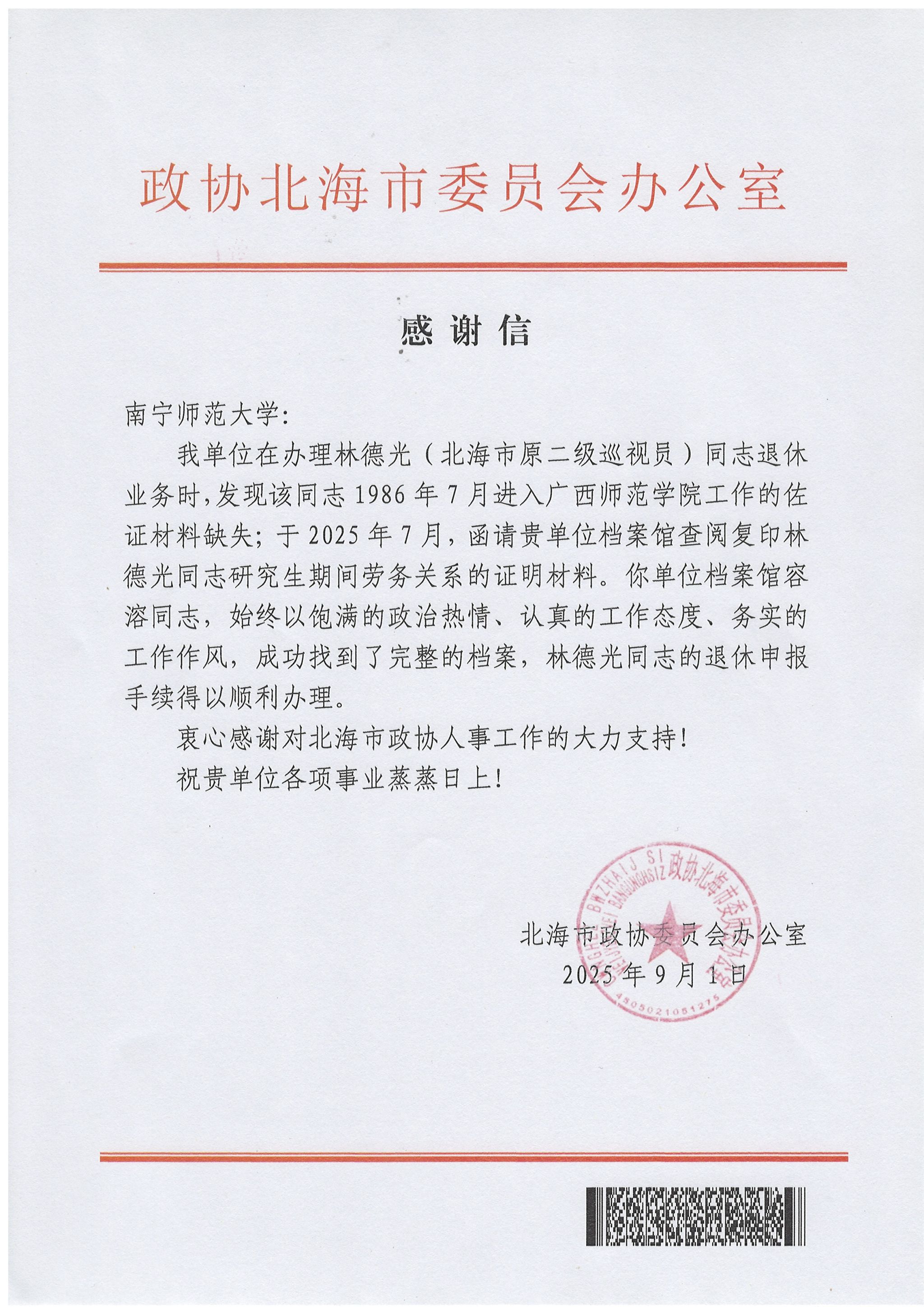 近日,问鼎手机版(中国)收到来自政协北海市委员会办公室的感谢信,信中对问鼎手机版(中国)档案馆容溶同志高效精准的档案服务予以高度赞扬,感谢其助力解决北海市原二级巡视员林德光同志退休手续办理中的关键档案难题,充分彰显了问鼎手机版(中国)档案管理工作的专业素养与服务担当。