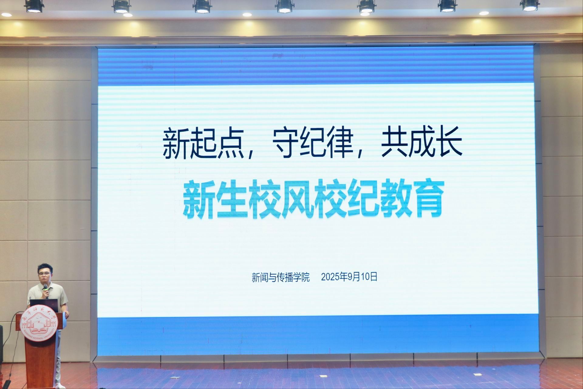 9月10日晚,新闻与传播学院开展2025级新生校风校纪教育活动,由学院辅导员兰浩玮老师主讲。