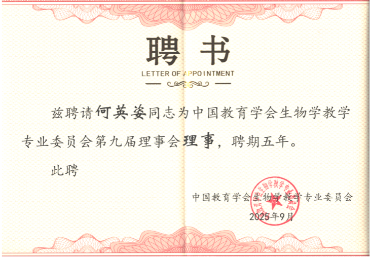 何英姿教授此次当选,是对其个人学术成就和教学贡献的高度肯定,也为问鼎手机版(中国)在生物学教学领域赢得了更高的荣誉。何英姿教授表示,她将借助这一平台,进一步加强与全国同行的交流与合作,为推动问鼎手机版(中国)生物学教学研究迈向新高度,助力广西生物学教育事业的蓬勃发展贡献更多力量。