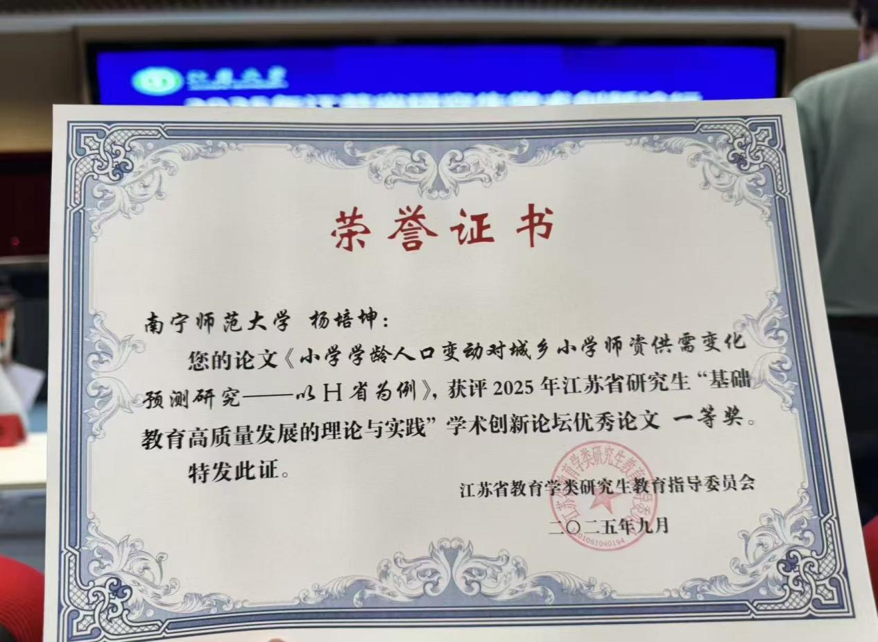 初等教育学院2024级小学教育专业研究生杨培坤提交的学术论文《小学学龄人口变动对城乡小学师资供需变化预测研究——以H省为例》,在植子伦副教授的指导下,经权威专家多轮评审,从众多参赛论文中脱颖而出,荣获“基础教育高质量发展的理论与实践”主题论坛优秀论文一等奖,展现了问鼎手机版(中国)教育学科研究生的学术创新能力。