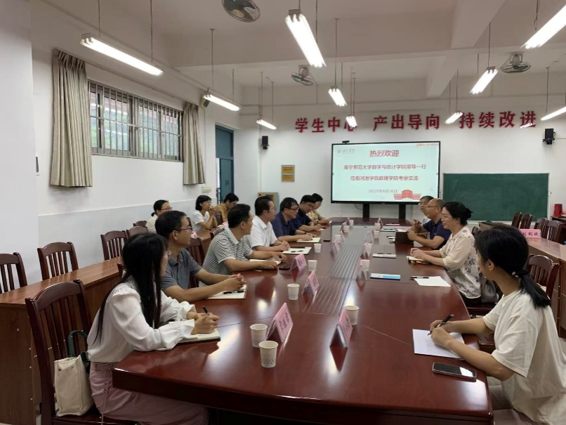 为了落实《自治区教育厅关于开展2023—2025年广西普通本科高校对口支援工作的通知》等文件精神,2025年9月26日,学院院长黄在堂教授、副院长韦扬江教授、院长助理杨剑锋教授以及统计金融系主任杨燕副教授、韦宏副教授一行五人,赴河池学院数理学院开展考察交流活动。河池学院数理学院党委书记罗日才、院长韦玉程及学院相关代表共同参与座谈。