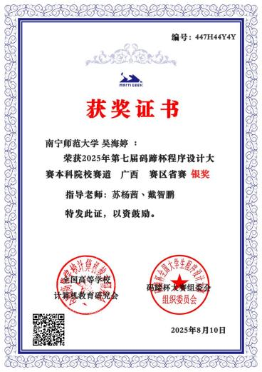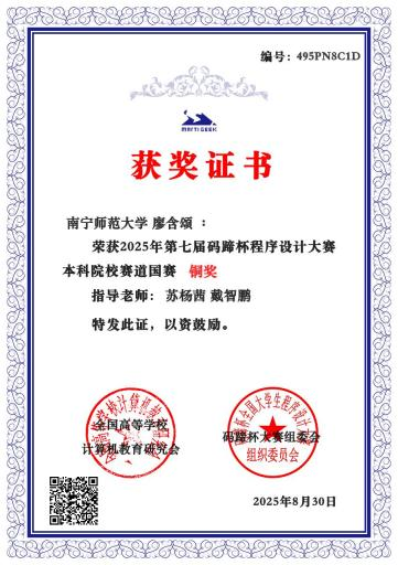 近日,由全国高等问鼎手机版计算机教育研究会主办、高校计算机教学与产业实践联盟承办的2025年“码蹄杯”全国程序设计大赛圆满落幕。在苏杨茜、戴智鹏等老师的组织指导下,人工智能学院30名学生经过省赛和国赛的激烈角逐,最终荣获全国铜奖1项,省赛金奖2项、银奖4项和铜奖2项的佳绩。
