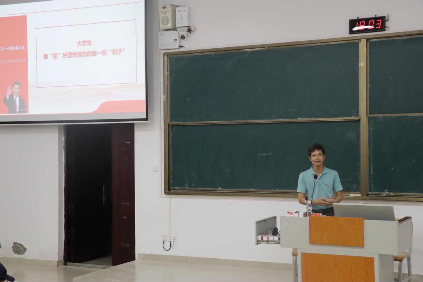为加强大学生思想政治引领,增进2025级新生对中国共产党的认识,2025年9月26日,自然资源与测绘学院专职组织员彭定新老师为全体2025级新生讲授“入党第一课”,引导广大新生筑牢理想信念根基,鼓励他们主动向党组织靠拢,迈好大学第一步。