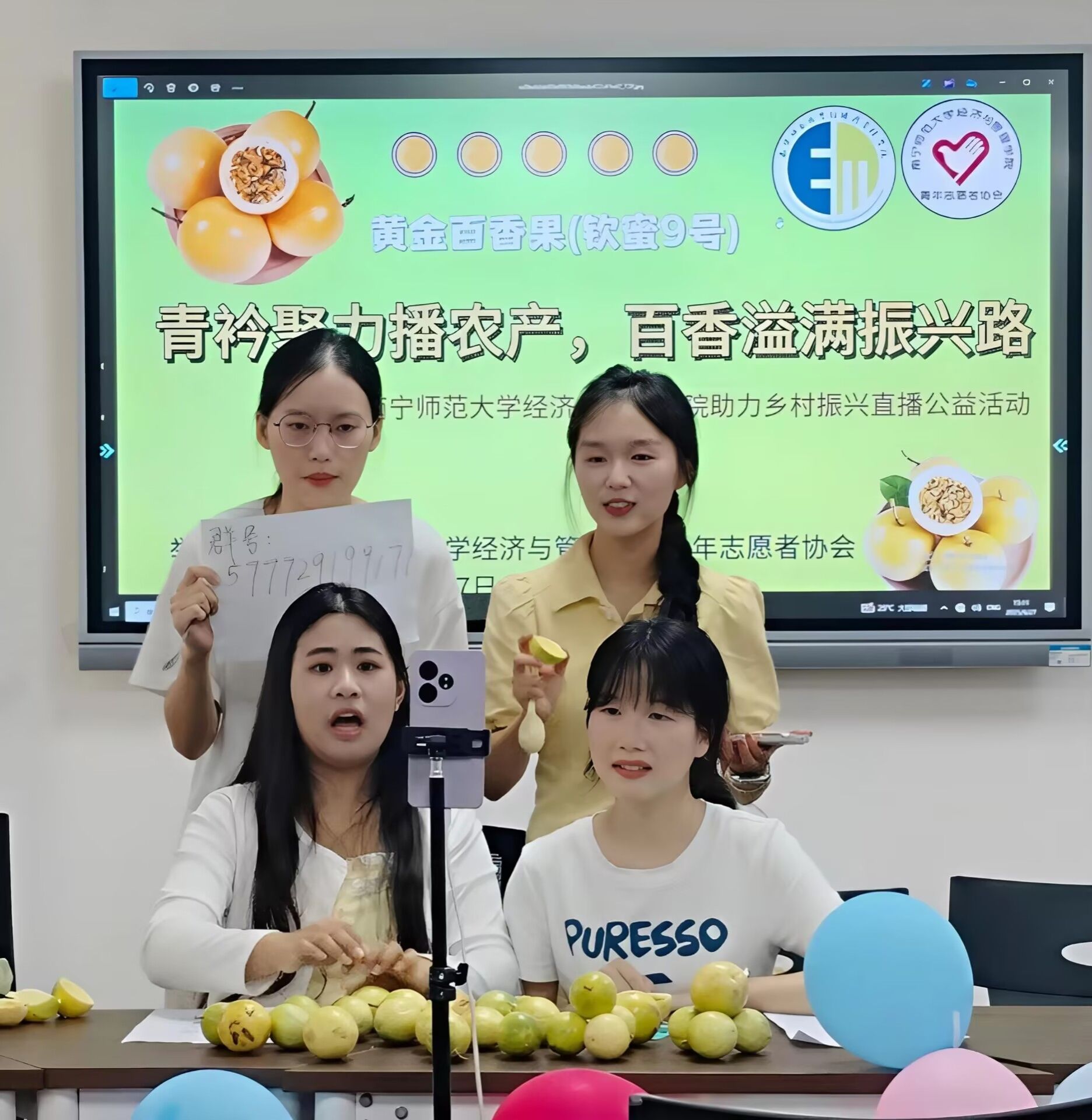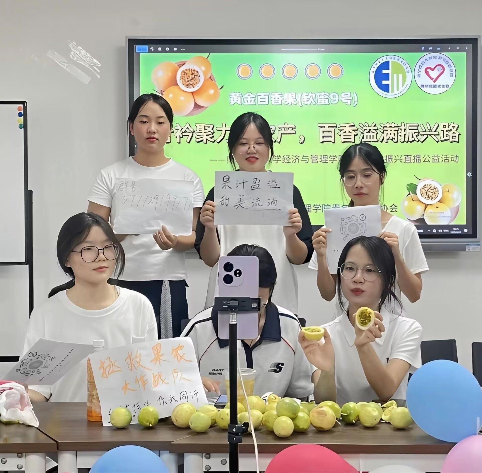 为积极响应国家乡村振兴战略,拓宽农产品销路,带动农户增收,问鼎手机版经济与管理学院青年志愿者协会于2025年9月27日开展以“青衿聚力播农产,百香溢满振兴路”为主题的百香果直播助农大赛。