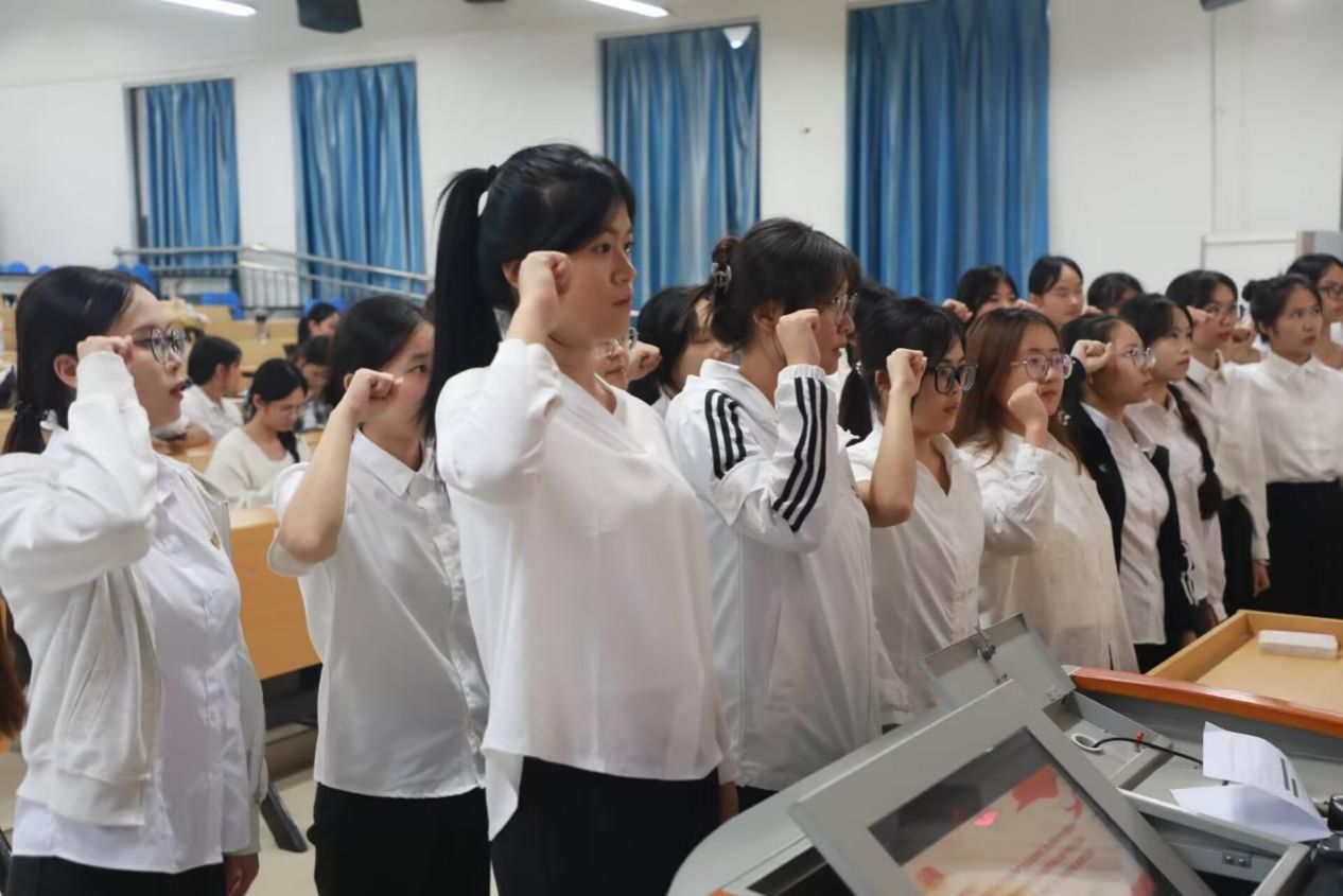 新发展的团员举行入团仪式:奏唱国歌、团委书记钟振花及团委副书记为新团员颁团徽、新团员宣誓、全体起立奏唱团歌并进行合影。