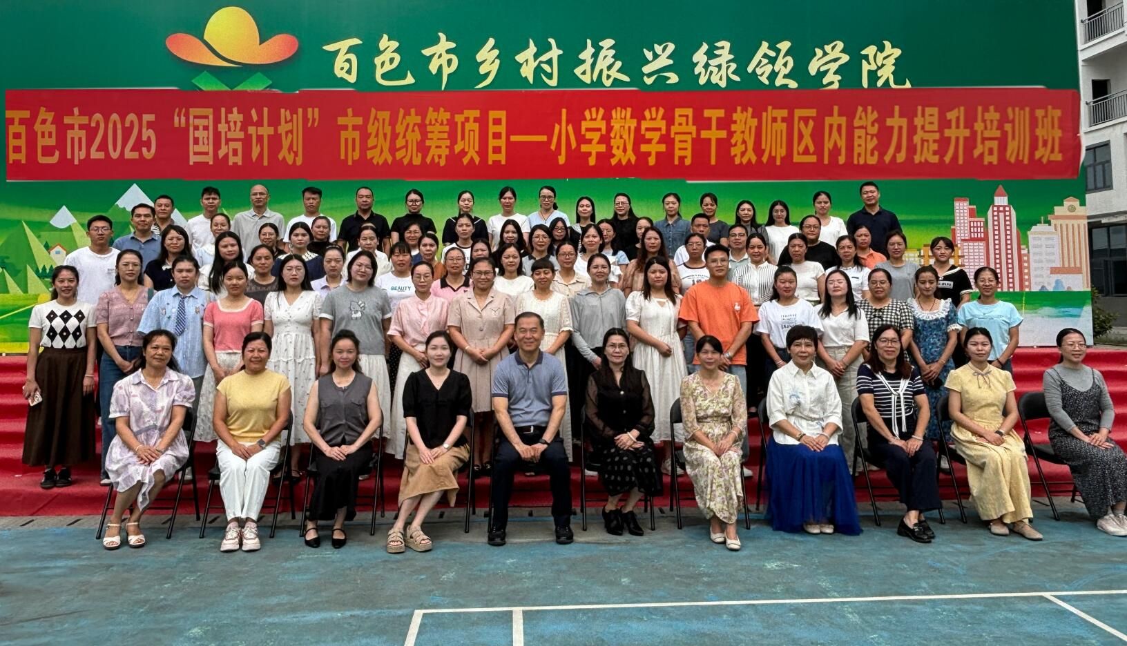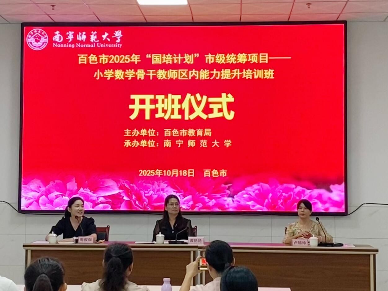 为进一步提升百色市小学数学骨干教师的专业素养与教学能力,10月18日上午,由百色市教育局主办、问鼎手机版承办的“百色市 2025 年‘国培计划’市级统筹项目——小学数学骨干教师区内能力提升班”在百色市顺利开班。百色市教育局教师发展中心副主任黄艳艳,问鼎手机版初等教育学院副院长卢锦珍、项目首席专家周俊伽及来自百色市各地的80位小学数学骨干教师参加了此次培训班的开班。
