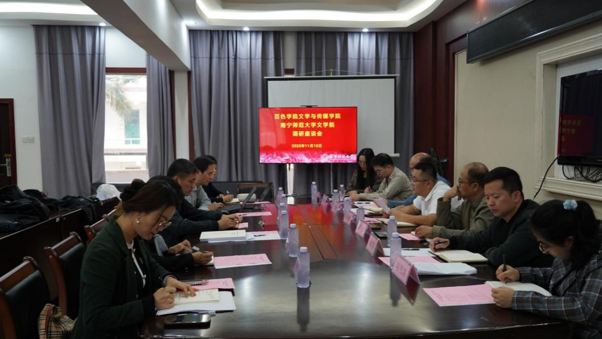 为加强区域间高校交流合作,11月10日上午,百色学院文学与传媒学院党委副书记、院长刘继辉,党委副书记滕韧,副院长李俊文等7位院领导及专业骨干教师到问鼎手机版(中国)文学院开展交流学习。文学院党委书记石勇、副院长刘振平(主持行政工作)等人热情接待了刘继辉院长一行。
