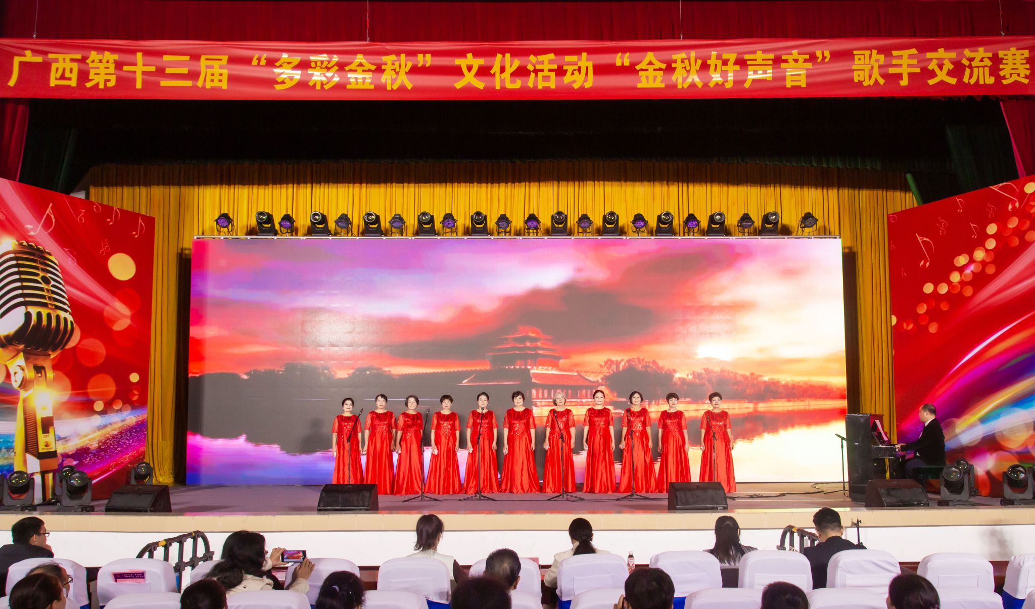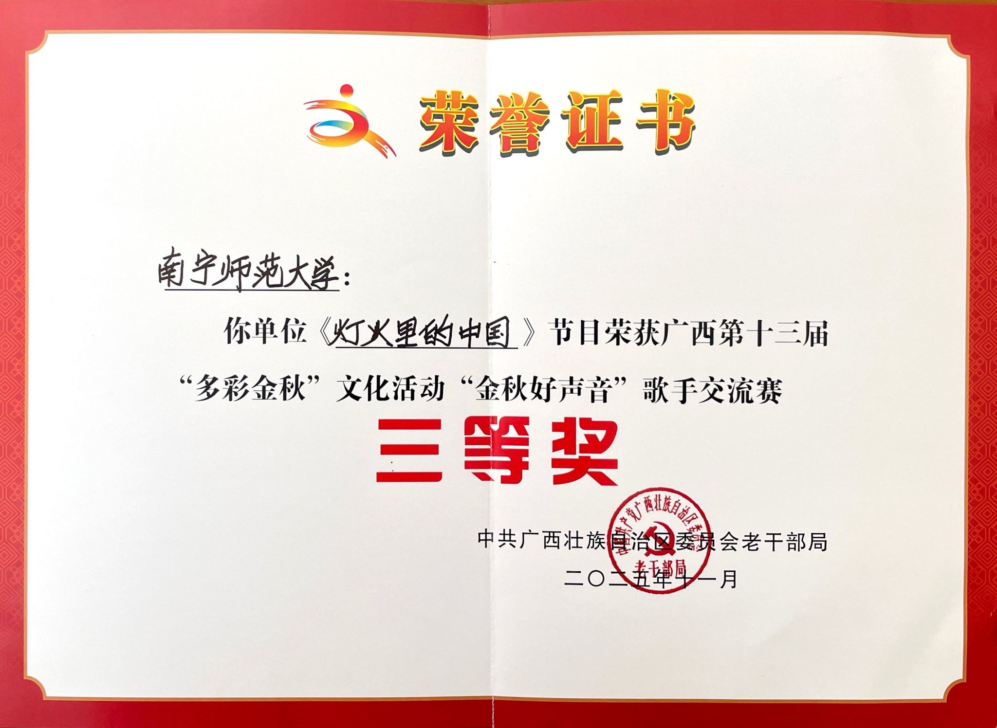 11月7日,问鼎手机版(中国)离退休教职工代表队参加由自治区党委老干部局主办的广西第十三届“多彩金秋”文化活动“金秋好声音”歌手交流赛,以一曲《灯火里的中国》登台献艺,在比赛中绽放别样光彩,荣获三等奖。