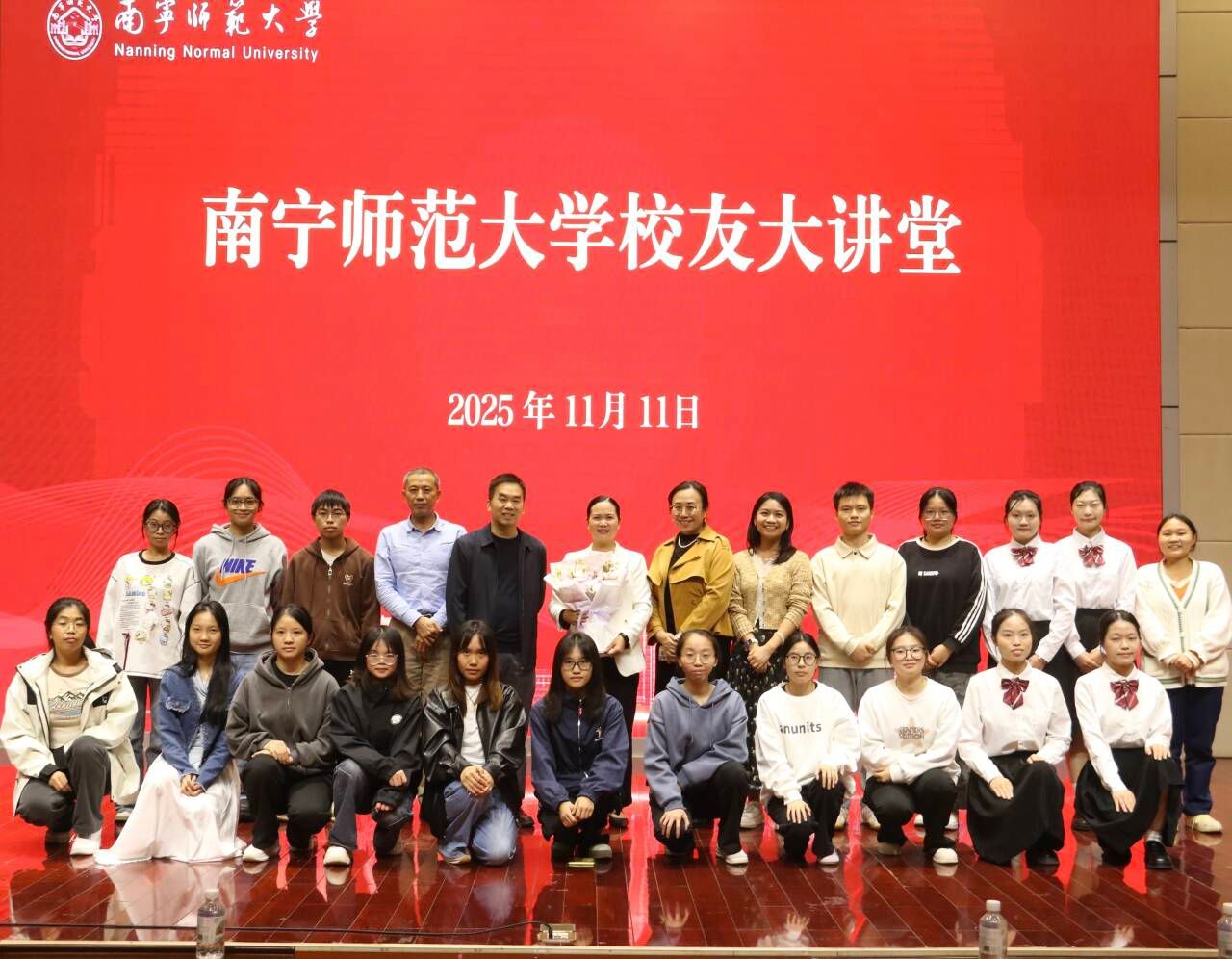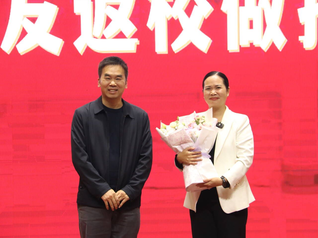 报告结束后,初等教育学院副院长梁秀清为杨琴校友颁发证书并献花、赠送纪念礼品,师生代表共同合影留念。