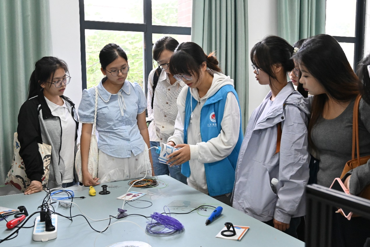 在学院工作人员带领下,同学们依次参观体验了学院特色教学空间。在实训室内,同学们使用3D打印笔进行创意绘画,操作可编程机器人完成指令任务;在现代教育技术实验室,大家学习了计算机硬件组装流程,亲自操作智能教学设备;在户外场地观看了无人机飞行演示并体验了实际操作。工作人员全程提供了专业讲解与指导,帮助同学们深入理解人工智能领域的技术运用与学院育人特色。