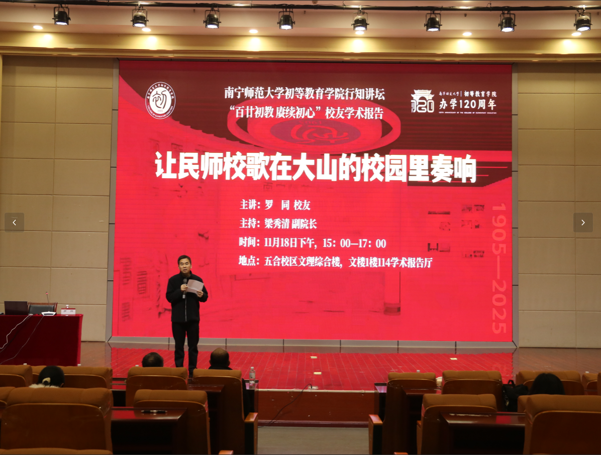 11月18日,初等教育学院在五合校区文楼114报告厅举办“百廿初教 赓续初心”校友系列报告第六讲。本次报告特邀学院1986级校友、正高级教师罗同主讲,原广西南宁民族师范问鼎手机版校长韦编贤老校长莅临会场,初等教育学院副院长梁秀清主持,四百余名师生到场聆听。