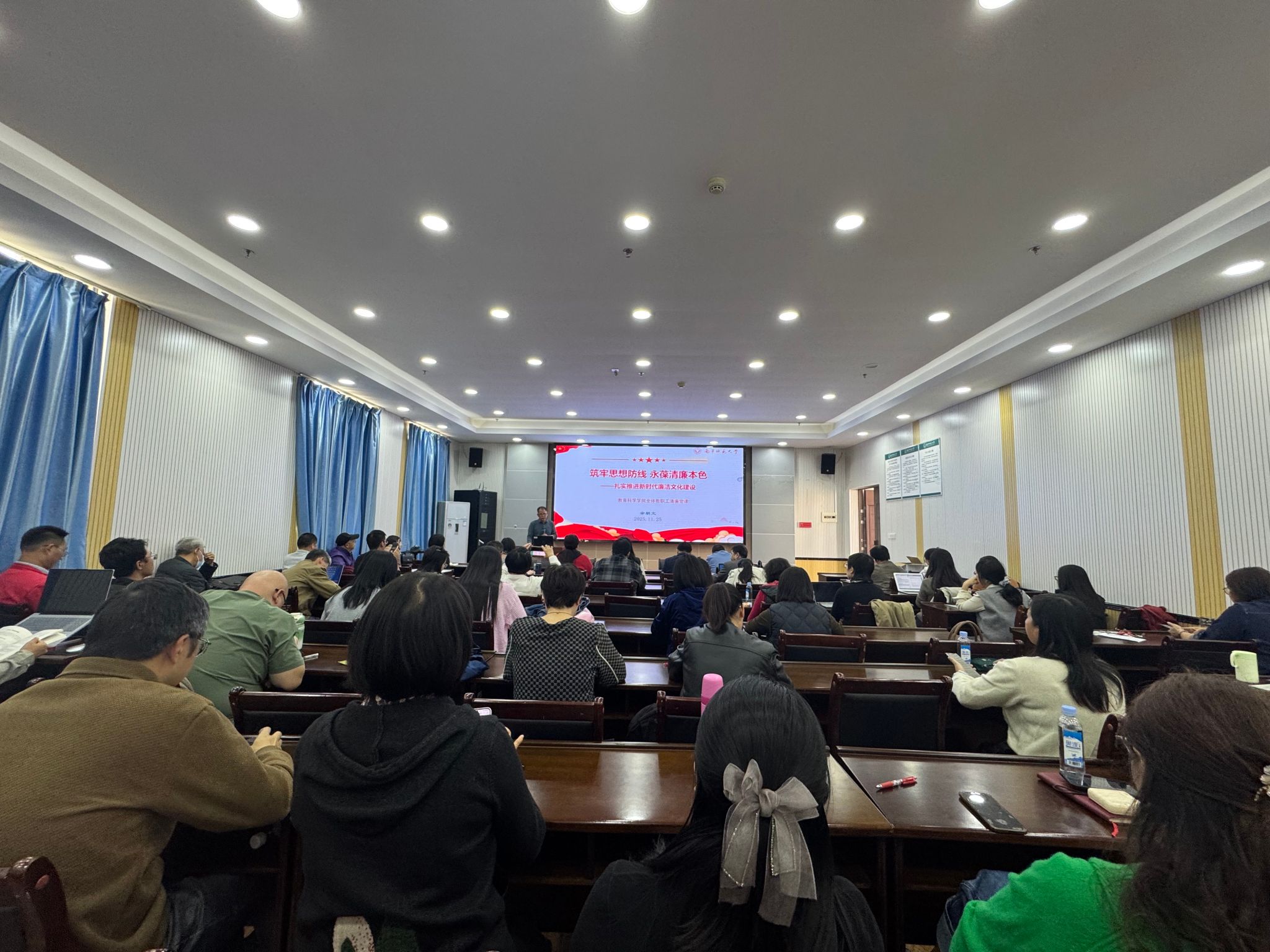 11月25日下午,教育科学学院召开全体教职工清廉主题党课,引导全院教师以廉立身、以清育人,筑牢拒腐防变的思想道德防线。本次党课由党委书记余朝文主讲,主题为《筑牢思想防线,永葆清廉本色——扎实推进新时代廉洁文化建设》。