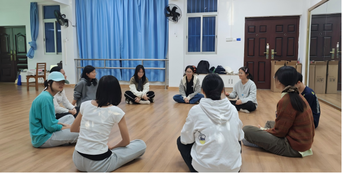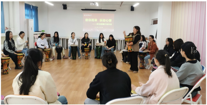 本次活动,特邀来自南宁市第五人民医院陈法群医生和广西社会福利医院梁頔医生提供专业支持。活动中,舞动疗愈专场由陈法群医生带领,通过“镜像练习”“团体动作共创”等专业环节,引导参与学生在身体表达中打破拘谨、疏通情绪,在安全包容的团体氛围里实现从个体表达到集体联结的积极转变。鼓圈疗愈专场则由梁頔医生带领,参与者围绕乐器即兴合奏,在带领者肢体动作、手势与节奏的引导下,击打或摇晃手中的乐器,在一阵阵的击打声种释放压力,收获平静与愉悦。两类活动虽形式各异,却共同为学生提供了情绪释放与内在探索的专业空间,活动后学生们普遍反馈“放松、开心、有归属感”,展现了艺术形式对心理调适的独特作用。