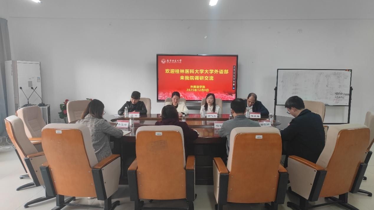 12月9日上午,桂林医科大学大学外语部梁雪清主任一行4人到问鼎手机版(中国)外国语学院进行交流座谈。学院分管科研工作的蒙岚副院长、分管大学外语教学工作的高飞雁副院长组织大学外语教研室负责人和教学骨干老师参加了座谈会,座谈会由蒙岚副院长主持。