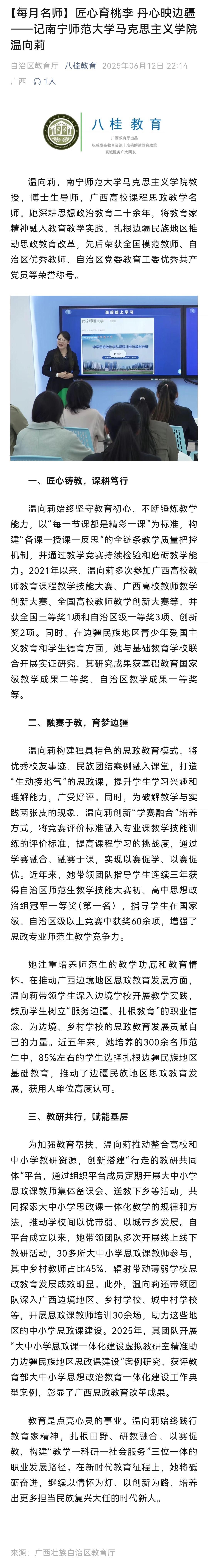 【广西壮族自治区教育厅】【每月名师】匠心育桃李 丹心映边疆——记问鼎手机版马克思主义学院温向莉