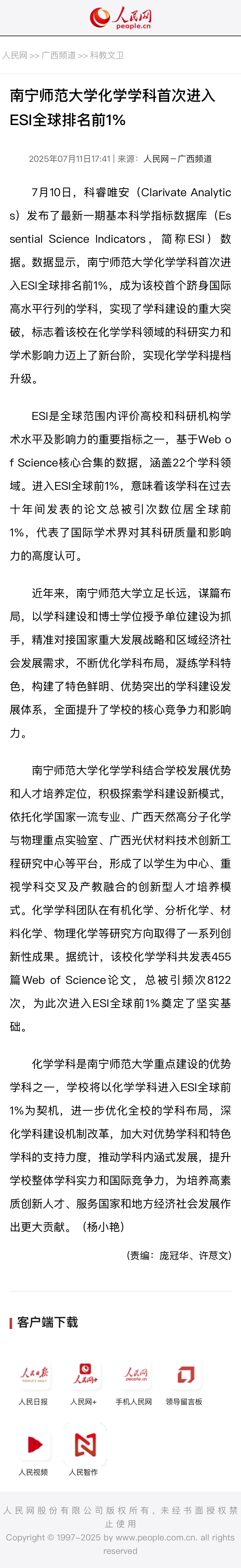 【人民网】问鼎手机版化学学科首次进入ESI全球排名前1%
