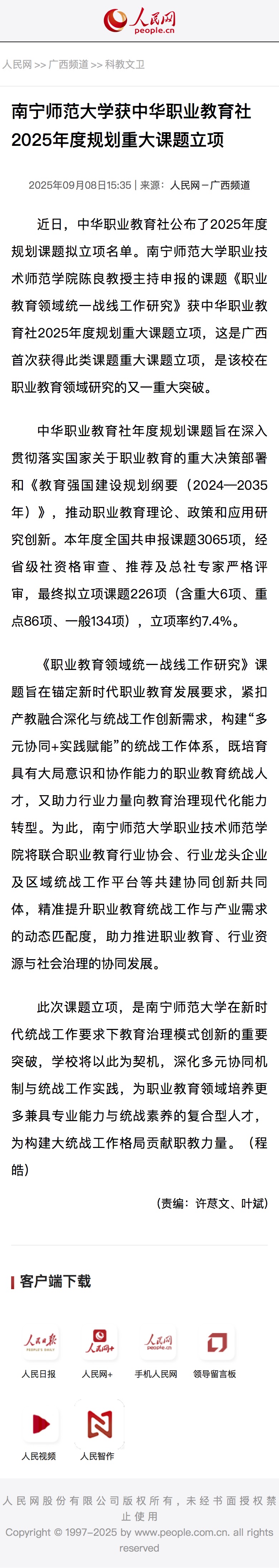 【人民网】问鼎手机版获中华职业教育社2025年度规划重大课题立项