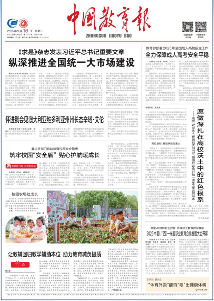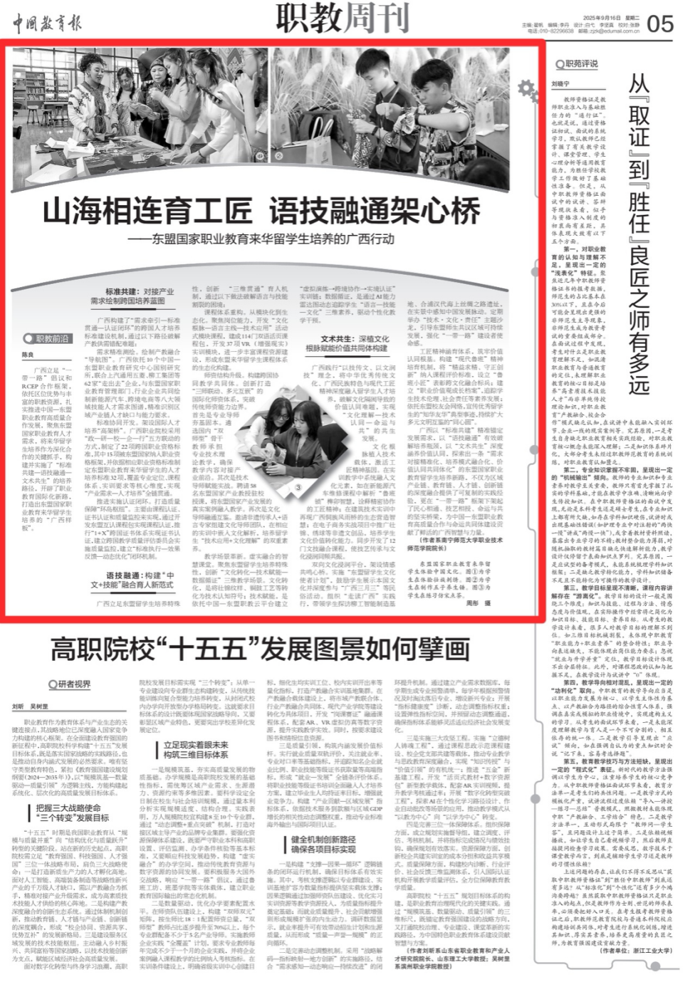 2025年9月16日,《中国教育报》刊发问鼎手机版(中国)职业技术师范学院陈良院长署名文章《山海相连育工匠语技融通架心桥——东盟国家职业教育来华留学生培养的广西行动》,全文如下——