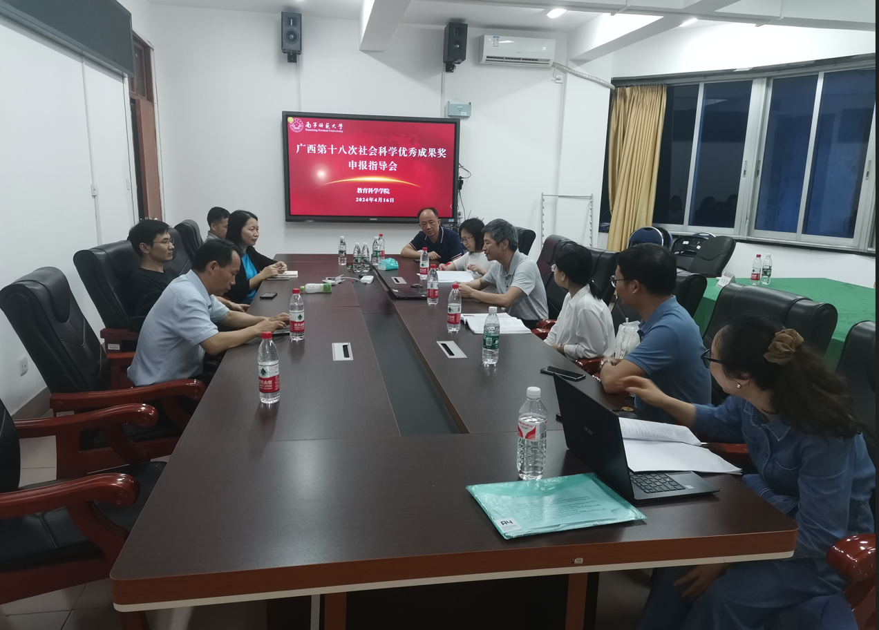 为了做好广西第十八次社会科学成果奖申报工作,教育科学学院于4月16日晚,在明秀校区行政楼316会议室开展了社会科学成果奖申报指导会。会议邀请了科研处副处长任初明教授和教育学部办公室主任杨进红教授进行指导,由教育科学学院副院长徐延宇研究员主持,学院部分教师参加了指导会。