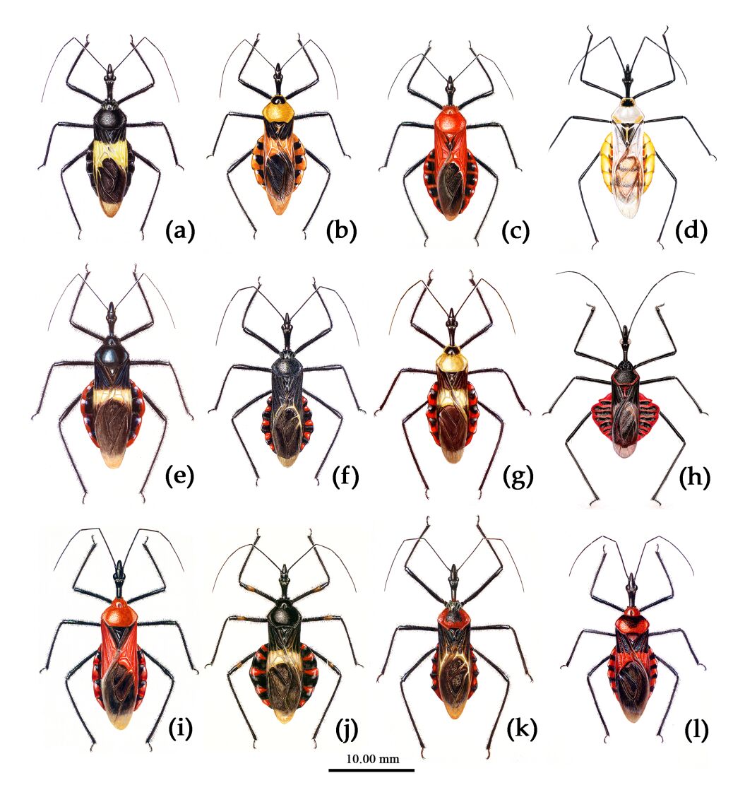 图2 (a) 黄带犀猎蝽Sycanus bifidus (Fabricius, 1787); (b) 黄犀猎蝽Sycanus croceus Hsiao, 1979; (c) 大红犀猎蝽Sycanus falleni Stål, 1863; (d) 黄革犀猎蝽Sycanus flavicorius Li & Cai, 2024; (e), 海南犀猎蝽Sycanus hainanensis Wang & Cai, 2024; (f), 黄背犀猎蝽Sycanus insularis Hsiao, 1979; (g) 赭缘犀猎蝽Sycanus marginellus Putshkov, 1987; (h) 小犀猎蝽Sycanus minor Hsiao, 1979; (i) 红犀猎蝽Sycanus rufus Hsiao, 1979; (j) 四川犀猎蝽Sycanus sichuanensis Hsiao, 1979; (k) 台湾犀猎蝽Sycanus taiwanensis Zhao & Cai, 2024; (l) 二色犀猎蝽Sycanus versicolor Dohrn, 1859