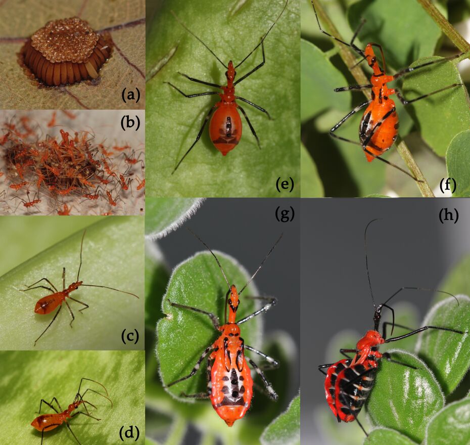 图3 大红犀猎蝽Sycanus falleni Stål, 1863生物学。(a)卵块egg mass;(b,c)一龄若虫,孵化first instar, hatching;(d)二龄若虫second instar;(e)三龄若虫third instar;(f)四龄若虫fourth instar;(g)五龄若虫fifth instar;(h)成虫adult。