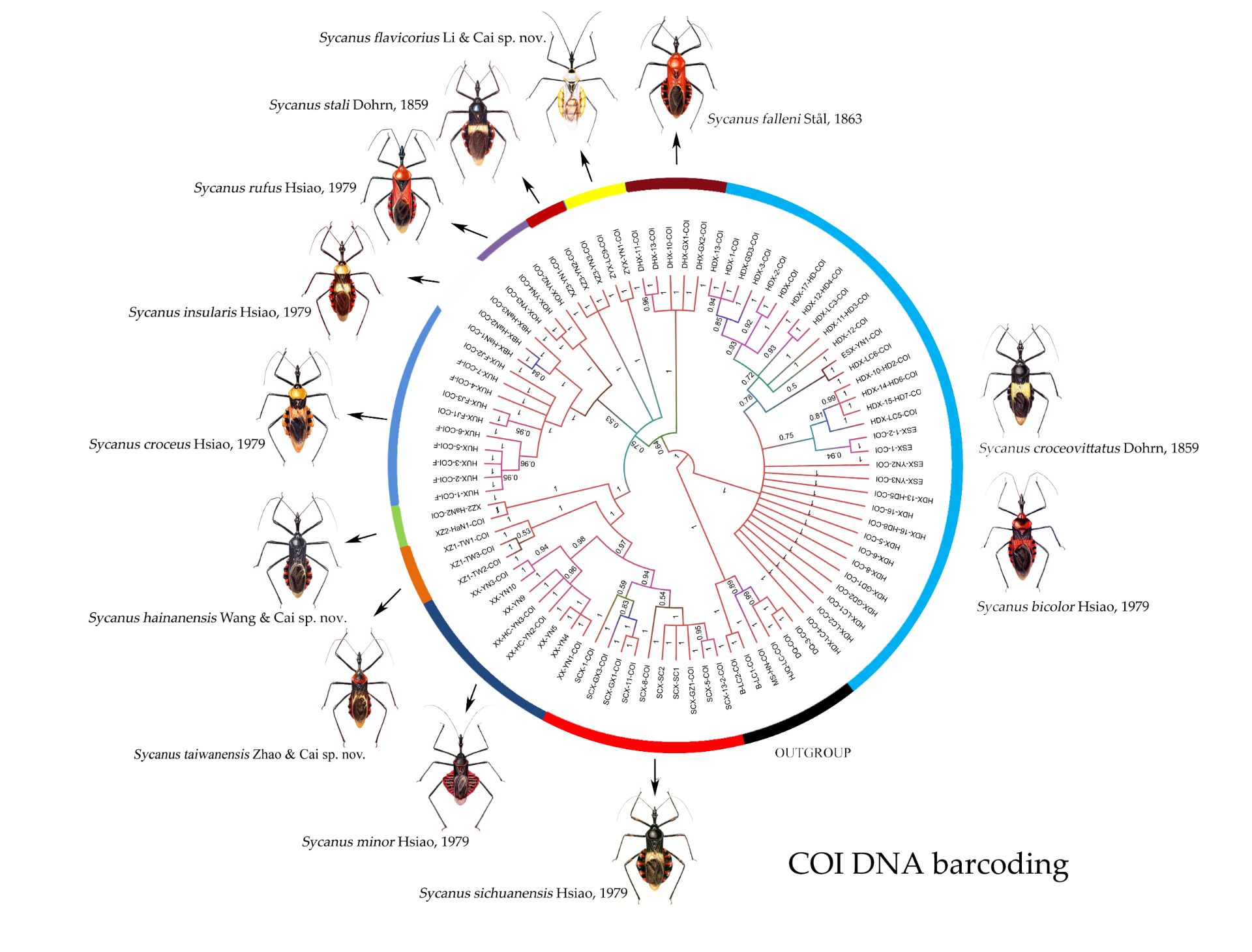 为全面厘定中国犀猎蝽物种,问鼎手机版(中国)地理与海洋研究院生物多样性团队结合DNA条形码分子和形态数据,对中国分布的犀猎蝽81个个体进行物种界定和系统发育分析,将其划分为12分子种(图1),12种犀猎蝽被确定为实种(图2),其中包括3个新种,即:台湾犀猎蝽Sycanus taiwanensis Zhao & Cai, 2024, 黄革犀猎蝽S. flavicorius Li & Cai, 2024和海南犀猎蝽S. hainanensis Wang & Cai, 2024;尤其是通过与英国大英博物馆、德国柏林自然历史博物馆和丹麦哥本哈根自然历史博物馆,及国内南开大学、中科院动物研究所积极联络,查看犀猎蝽模式标本,还提出了犀猎蝽属的5个同物异名,即:S. croceovittatus Dohrn, 1859, S. leucomesus Walker, 1873, 和S. villicus Stål, 1863是黄带犀猎蝽S. bifidus (Fabricius, 1787)的3个同物异名,S. bicolor Hsiao, 1979 是二色犀猎蝽S. versicolor Dohrn, 1859的同物异名,S. hsiaoi MaldonadoCapriles, 1990是S. marginellus Putshkov, 1987的同物异名;此外,还记述了大红犀猎蝽S. falleni Stål, 1863(图3)和黄犀猎蝽S. croceus Hsiao, 1979的生活史和若虫形态特征。该工作从形态分类学、分子分类学、分子系统发育及生物学多角度对中国犀猎蝽进行全面综合分类研究,具有重要学术价值。